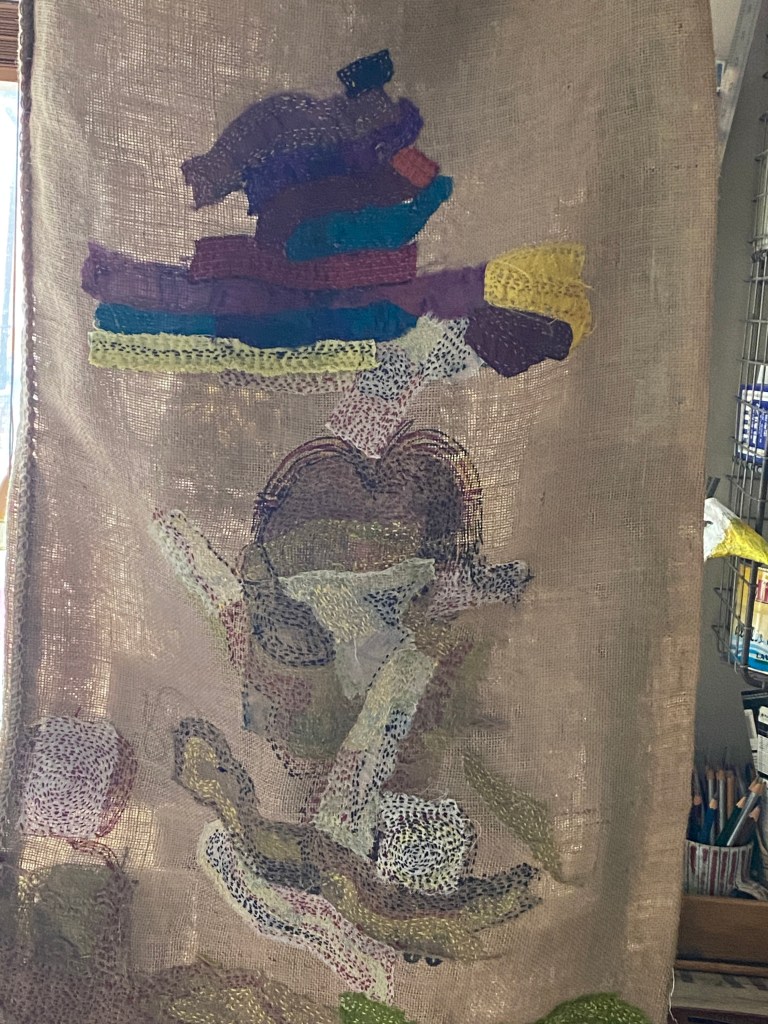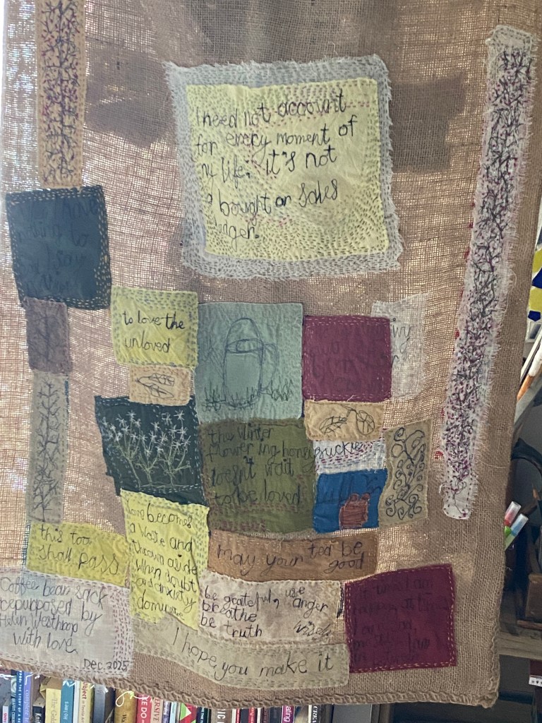 Last summer a friend sent me a coffee bean sack in the post. Not so strange as it sounds as for many years now, I have embroidered sacks, so friends are inclined to gift me one or two from time to time. However, not all were suitable because I disassemble them, so I have a beautiful flat expanse to work on to make a ‘hanging’ and no longer any kin to a sack. So, I shamelessly disregard a damaged sack and wonder why anyone would open a sack with a knife and render it useless. When it is very easy to remove the stitching and therefore facilitate further use. So, when I opened the parcel, I disappointed that the sack had been opened with a knife and severely wounded and the sight was surprisingly overwhelming and my gut said ‘repair it and give it use’. Little did I know that as winter loomed, I too was feeling damaged. Not visibly like the sack but seemingly irreparable. So, while I began the repair in the late summer when the winter rains came with unending heaviness, the need for gentle repair became more urgent, almost with vengeance. Each day from 1st December I stitched and stitched random colours and threads and as I greet the spring the job is almost done. It is still a sack, mended no longer containing coffee beans but filled with love, good wishes and hope. I have much to be thankful for.