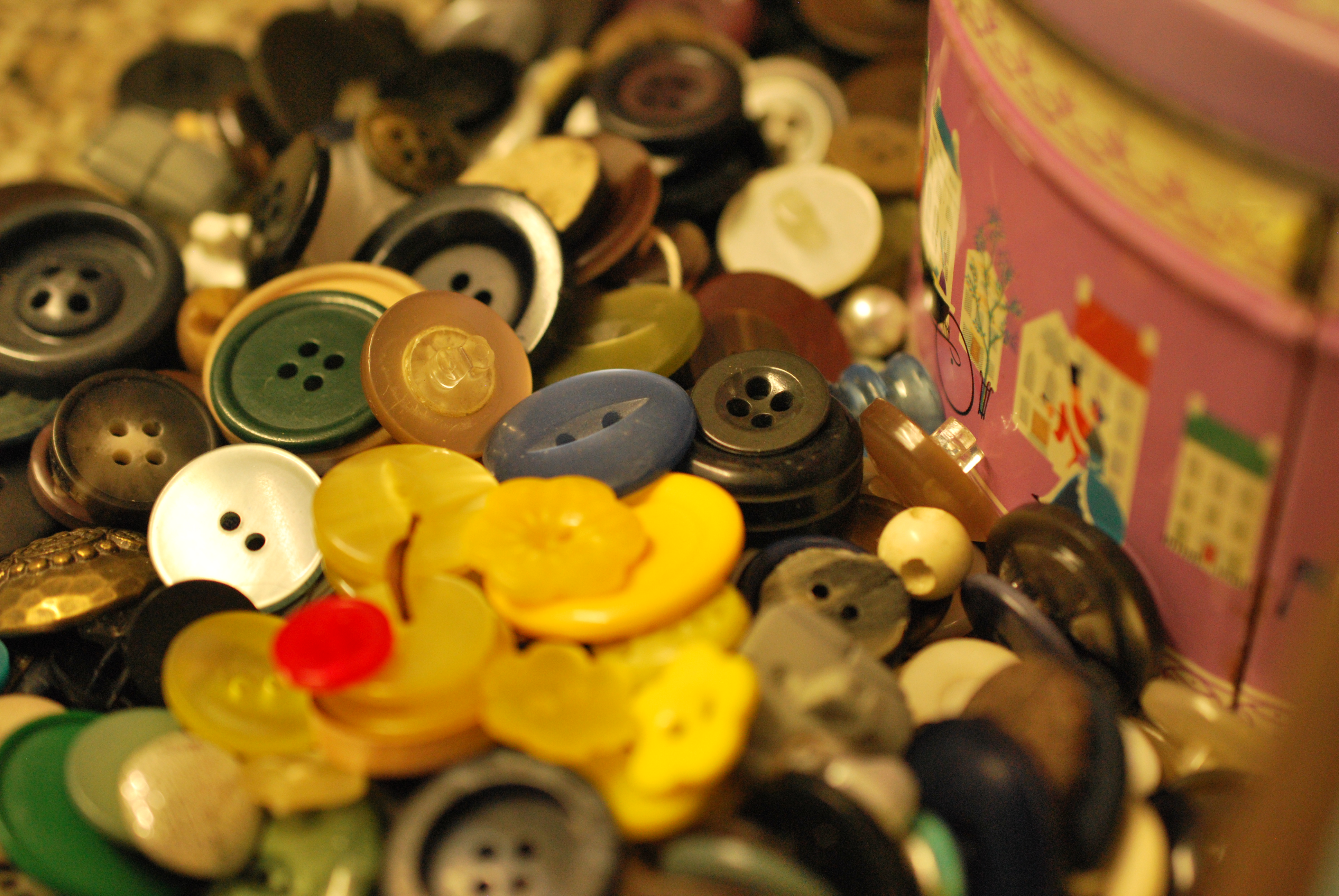 I have a collection of buttons in an old rusty Quality Street toffee tin. It reflects my life of dressmaking, mending and making do. My mother started when we were children, she would remove the buttons from dresses that we had out-grown become beyond repair. Also from shirts that had had their collars and cuffs turned enough! They were a constant resource in our childhood games and used when we too began to dress- make.