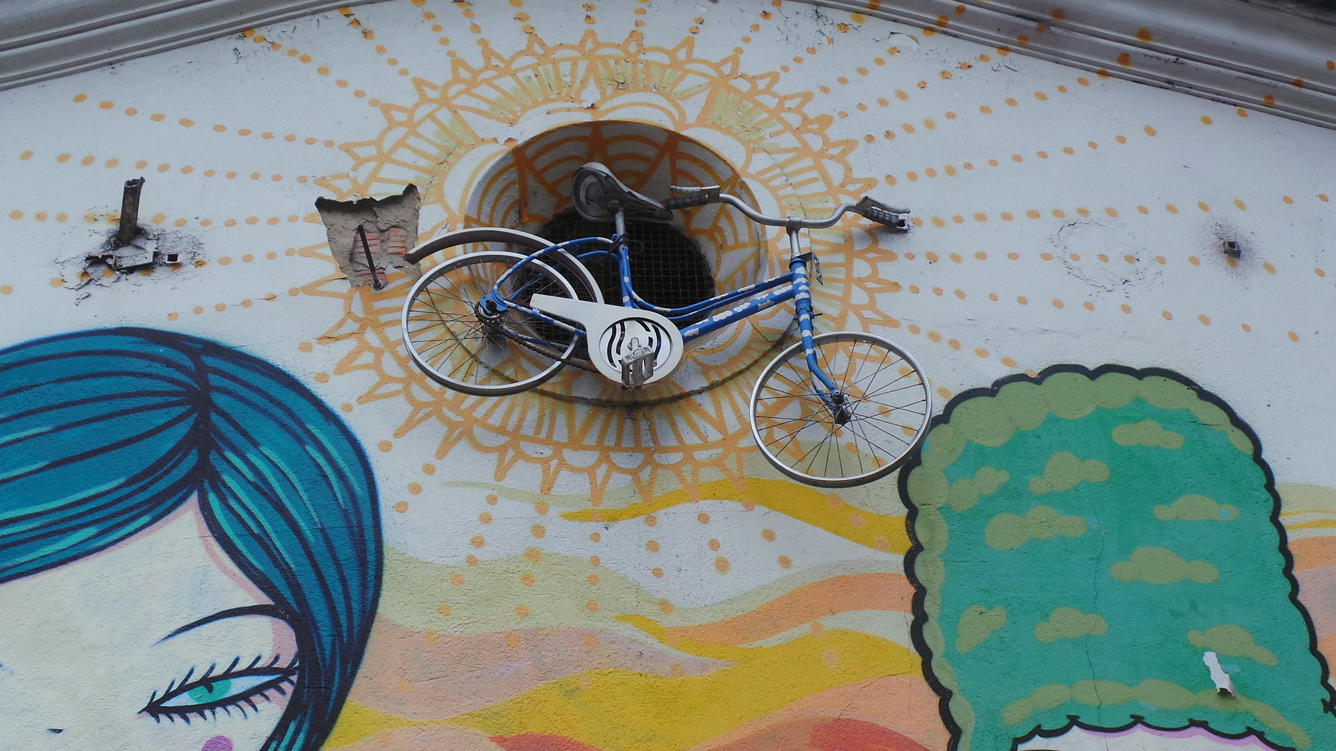 That is an interesting piece of street art. So cool, and so creative. Like a flying bicycle. I wouldn’t go too near, though, for fear of it crashing down on me. But I’m sure it’s secured tightly. Great shot 🙂