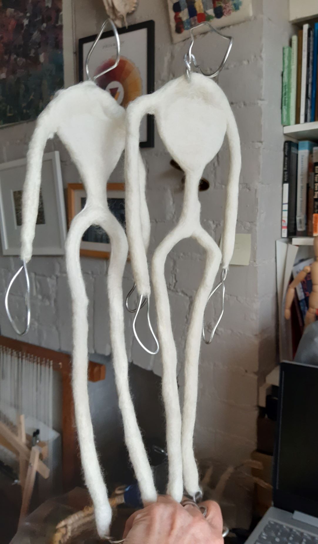 As promised by the BBC rain has set in; so, having walked as the not promised sun came up, I am now confined to my little studio for an hour or so. Bereft of good news and noting how awfully dull the bad news has become; I thought I might tell you about my coat hanger people. The characters I am working with at present are the third incarnation. In the beginning using dry felting they were rather Neanderthal.