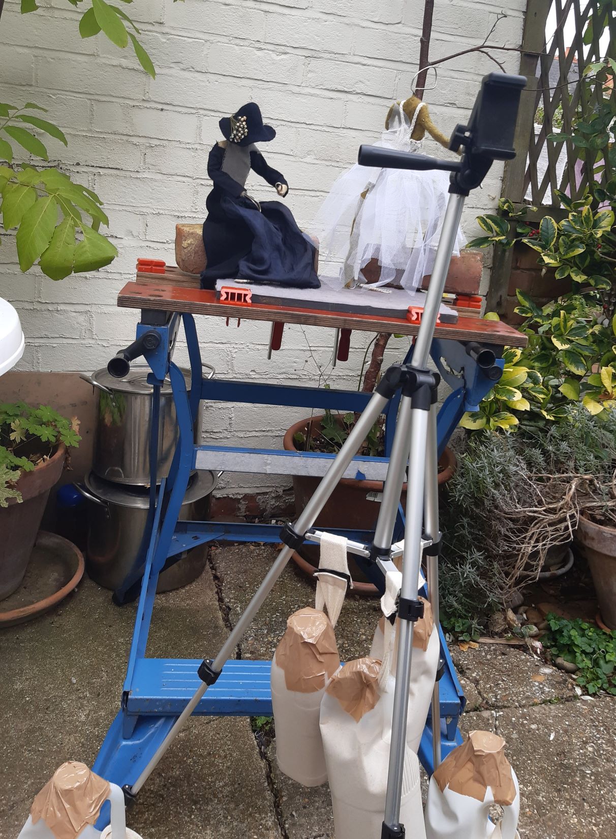 While my journey into animation has been closely mixed with the notion of marionettes and puppetry for me, they are symbiotic; until one discusses the stage required. I use a Black and Decker Work Mate as an animator might use a tabletop; with an adjustable pair of vices with the use of clamps I can rig up a back screen. This, Binyon suggests, is a plain curtain or painted background and best so the puppets so they can be seen as clearly as possible. ‘Your marionettes must be so expressive so the audience will imagine the scene’ (Binyon, H. 1966) As my puppets do not have strings or hands to govern them, I do not need a complicated structure or a proscenium stage with more complex lighting system. Filming outside, while I do not have light difficulties, I am limited to daylight hours. I have experimented with back screens and discovered that while they might add another element to the action and story, they do cause technical problems with camera, when it focuses on the back cloth instead of the characters. With careful stitching I have learned to make them less attractive to the camera lens. It is for this reason Binyon does not advocate scenery. As I am a Textile artist first and puppeteer at present by default and due the Covid isolation I am keen to find an alternative to my garden limits, such as the bushes, trees, and my neighbour’s washing as it blows in the wind.