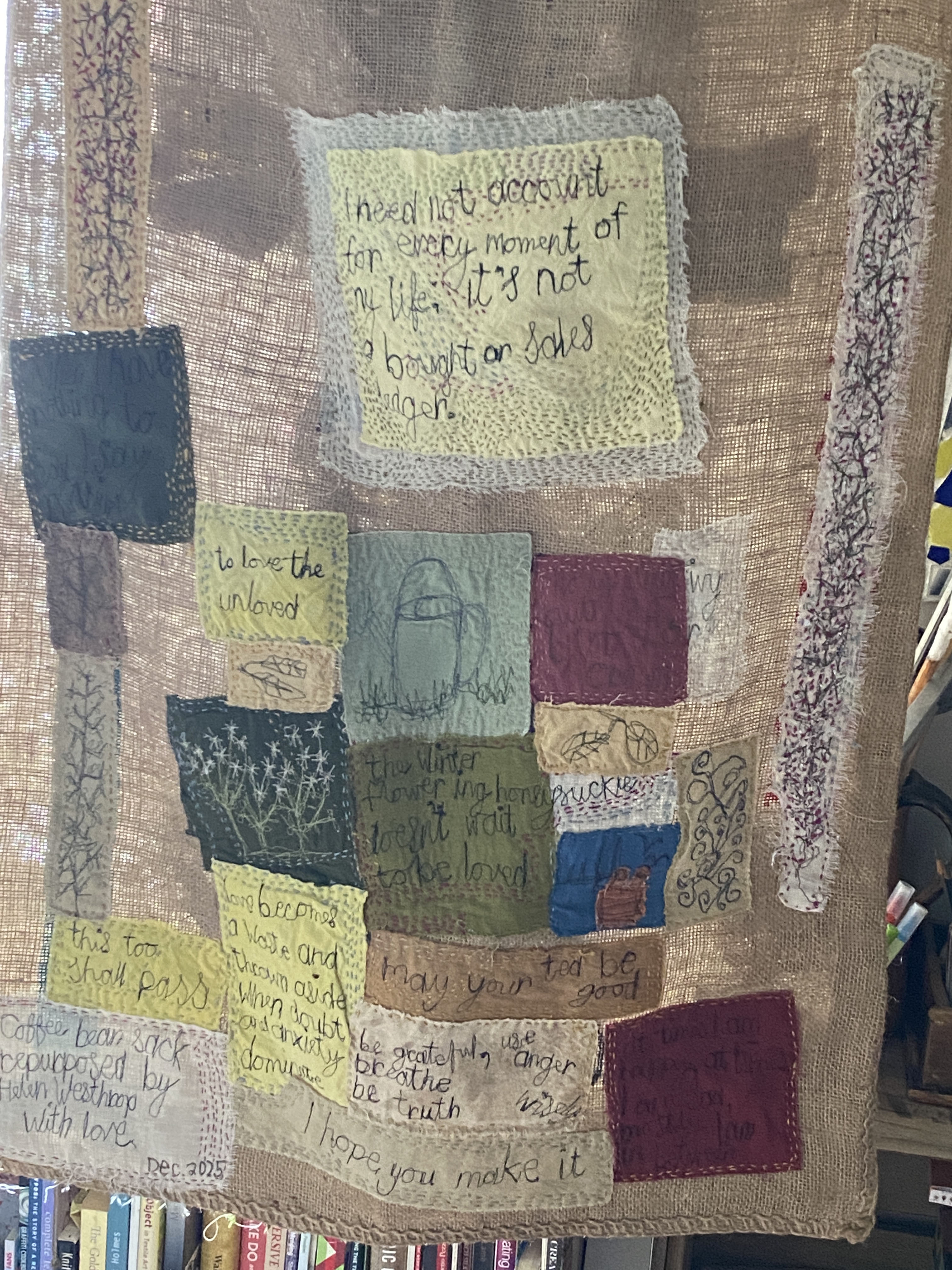 Last summer a friend sent me a coffee bean sack in the post. Not so strange as it sounds as for many years now, I have embroidered sacks, so friends are inclined to gift me one or two from time to time. However, not all were suitable because I disassemble them, so I have a beautiful flat expanse to work on to make a ‘hanging’ and no longer any kin to a sack. So, I shamelessly disregard a damaged sack and wonder why anyone would open a sack with a knife and render it useless. When it is very easy to remove the stitching and therefore facilitate further use. So, when I opened the parcel, I disappointed that the sack had been opened with a knife and severely wounded and the sight was surprisingly overwhelming and my gut said ‘repair it and give it use’. Little did I know that as winter loomed, I too was feeling damaged. Not visibly like the sack but seemingly irreparable. So, while I began the repair in the late summer when the winter rains came with unending heaviness, the need for gentle repair became more urgent, almost with vengeance. Each day from 1st December I stitched and stitched random colours and threads and as I greet the spring the job is almost done. It is still a sack, mended no longer containing coffee beans but filled with love, good wishes and hope. I have much to be thankful for.