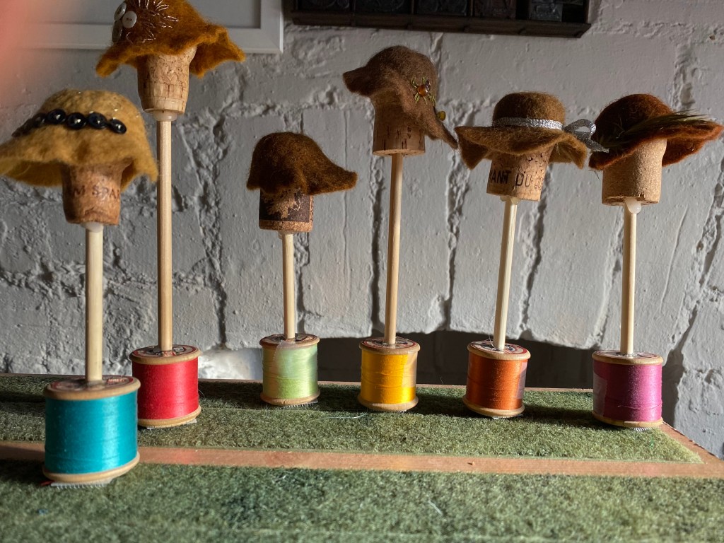 As time has passed, I am thinking that hats might have a useful and dramatic effect in coming films. I have also discovered that champagne corks make perfect sized hat moulds, so my kind neighbours have provided a few corks after recent New Year celebrations so I can be a milliner for a while … please watch this work in progress.
